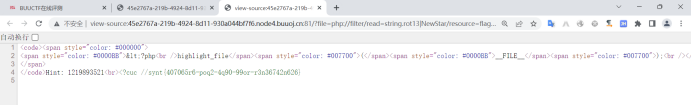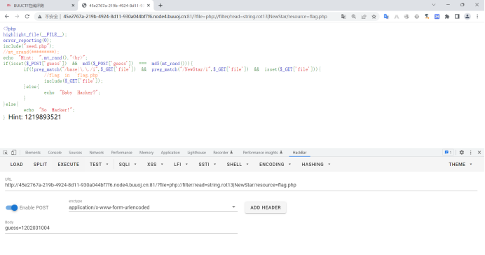 第二个if两个正则表达式,这里我们可以使用到伪协议了,但是因为base被过滤了,所以我们可以使rot13来代替,但是要包含NewStar,所以这里要介绍一个伪协议的特性了,过滤器是可以随便写的,所以这个字符串可以放在过滤器中,构造payload:?file=php://filter/read=string.rot13|NewStar/resource=flag.php
