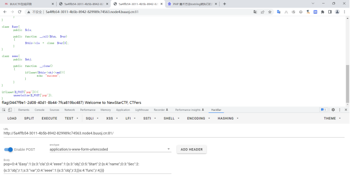 得出序列化的结果为:O:4:"Easy":1:{s:3:"cla";O:4:"eeee":1:{s:3:"obj";O:5:"Start":2:{s:4:"name";O:3:"Sec":2:{s:3:"obj";r:1;s:3:"var";O:4:"eeee":1:{s:3:"obj";r:3;}}s:4:"func";r:4;}}}