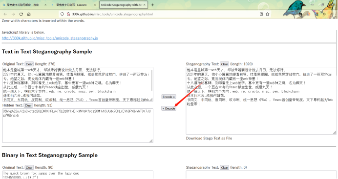 这是零宽度字符隐写,使用工具提取隐写的内容: