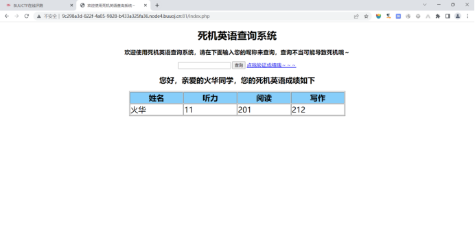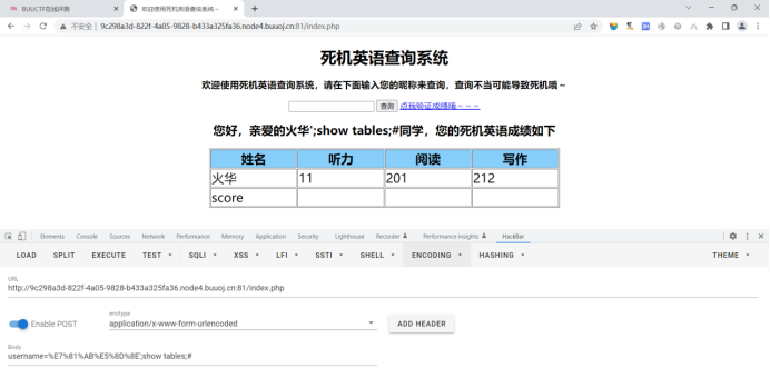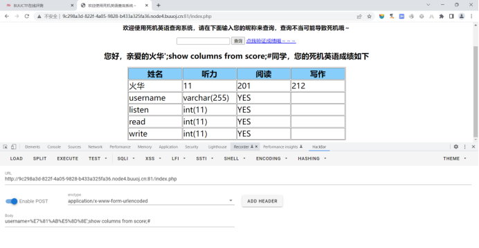 然后使用%E7%81%AB%E5%8D%8E’;show columns from score;#得到字段名