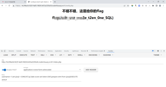 因为要帮火华师傅修改成绩啊,所以我们要使用update,但是被过滤了,所以我们这样来修改后台数据,使用-1’;set @sql =
