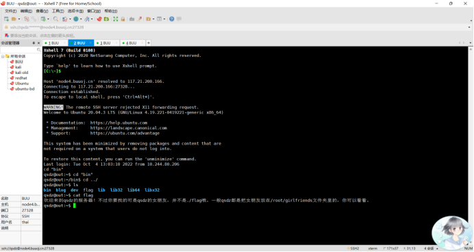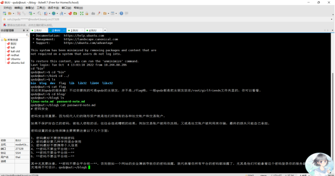 使用xshell连接,然后在用户目录发现了flag,查看发现了提示