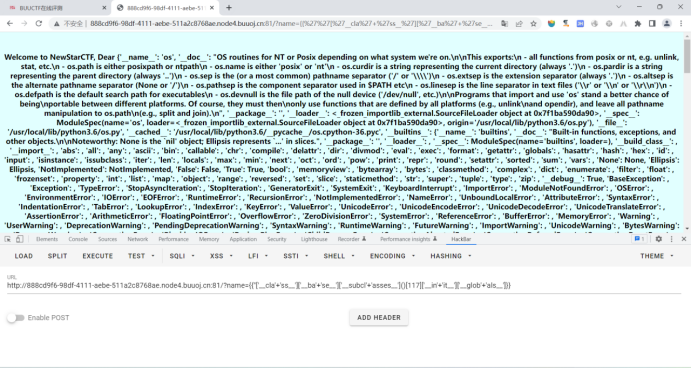 1 | 使用?name={{'''__cla'+'ss__''__subcl'+'asses__'117['glob'+'als']}} |