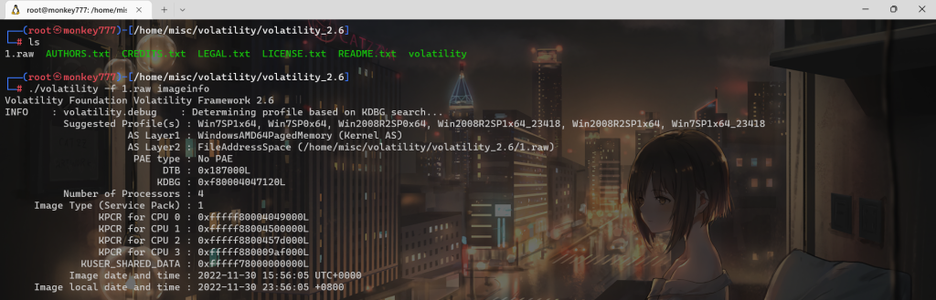 ./volatility -f 1.raw imageinfo