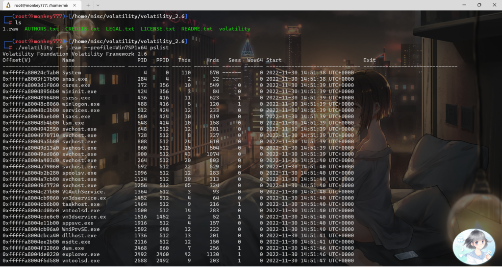 ./volatility -f 1.raw –profile=Win7SP1x64 pslist