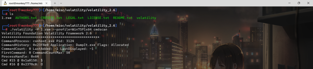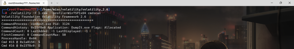 ./volatility -f 1.raw –profile=Win7SP1x64 cmdscan
