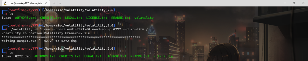 ./volatility -f 1.raw –profile=Win7SP1x64 memdump -p 4272 –dump-dir=./