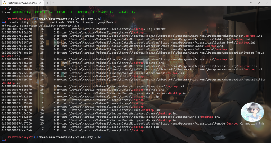./volatility -f 1.raw –profile=Win7SP1x64 filescan |grep Desktop