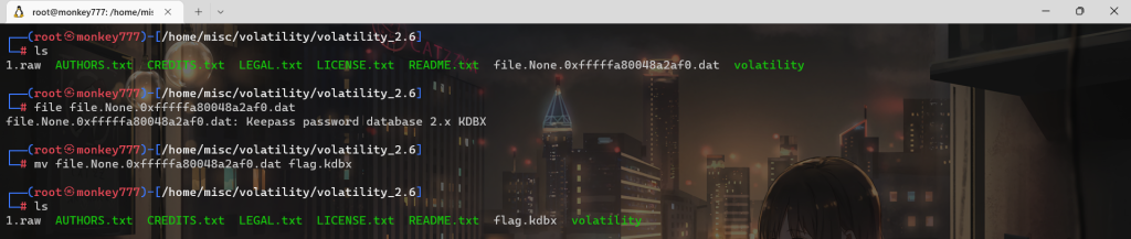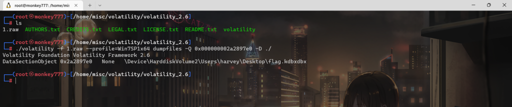 ./volatility -f 1.raw –profile=Win7SP1x64 dumpfiles -Q 0x000000002a2897e0 -D ./