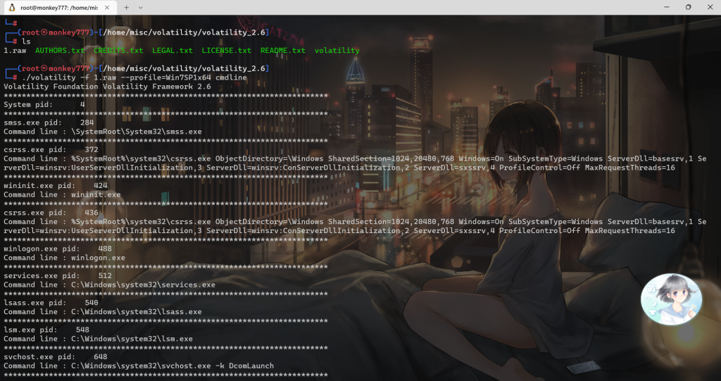 ./volatility -f 1.raw –profile=Win7SP1x64 cmdline