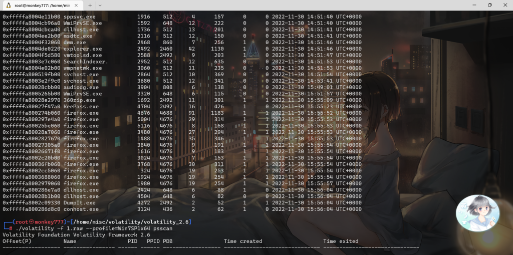 ./volatility -f 1.raw –profile=Win7SP1x64 psscan