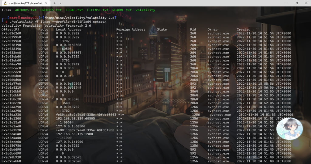 ./volatility -f 1.raw –profile=Win7SP1x64 netscan