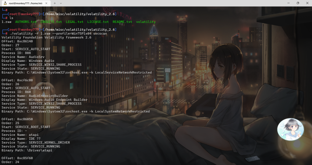 ./volatility -f 1.raw –profile=Win7SP1x64 svcscan