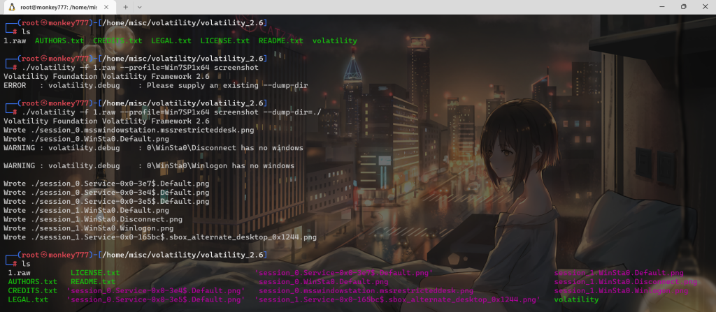 ./volatility -f 1.raw –profile=Win7SP1x64 screenshot –dump-dir=./