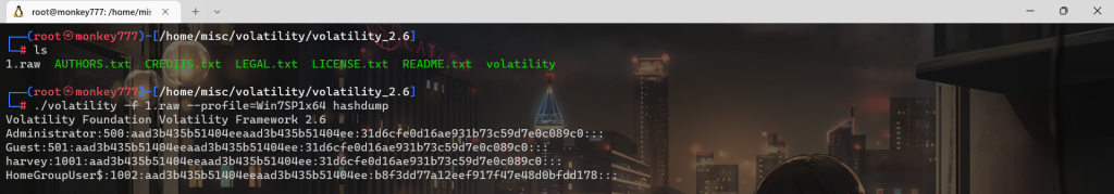 ./volatility -f 1.raw –profile=Win7SP1x64 hashdump