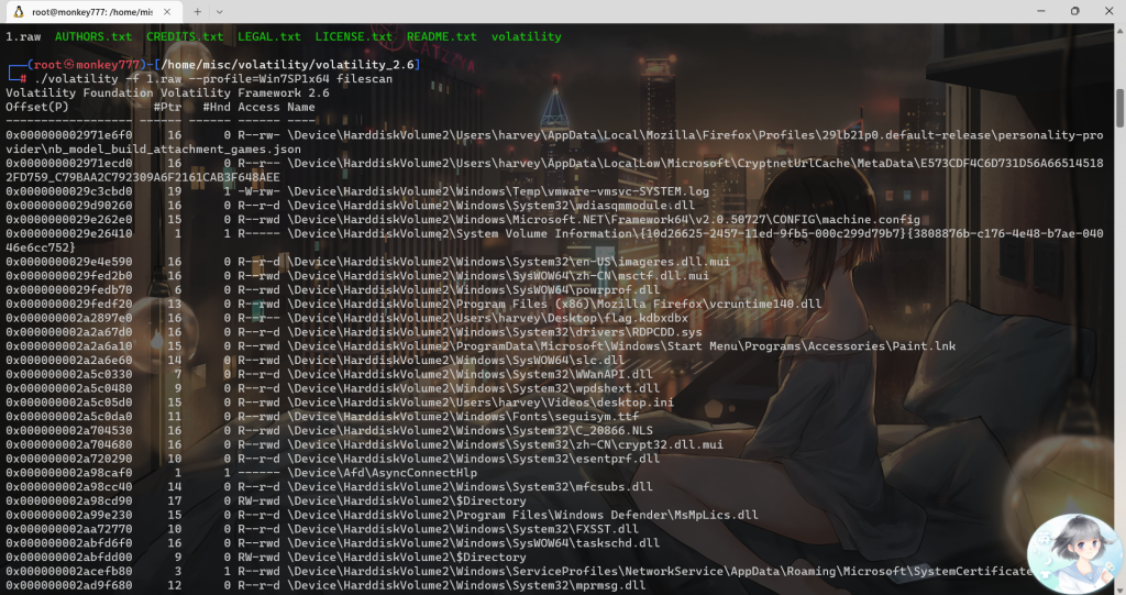 ./volatility -f 1.raw –profile=Win7SP1x64 filescan