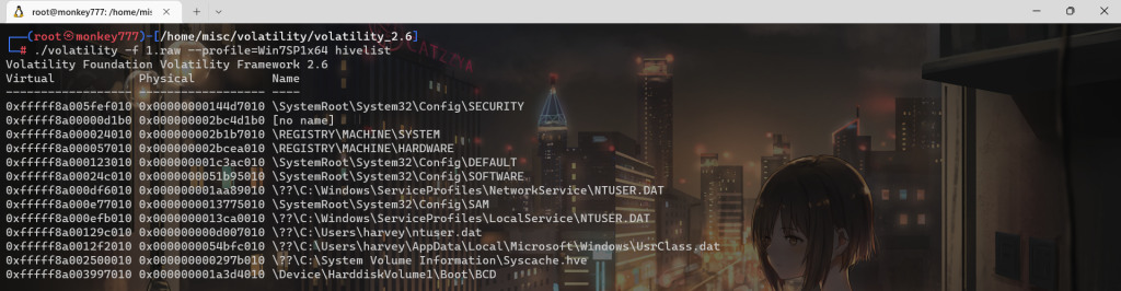 ./volatility -f 1.raw –profile=Win7SP1x64 hivelist