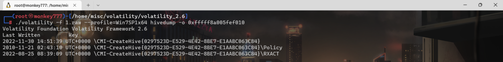 ./volatility -f 1.vmem –profile=Win7SP1x64 printkey -K “xxxxxxx”
