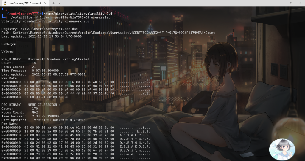 ./volatility -f 1.raw –profile=Win7SP1x64 userassist