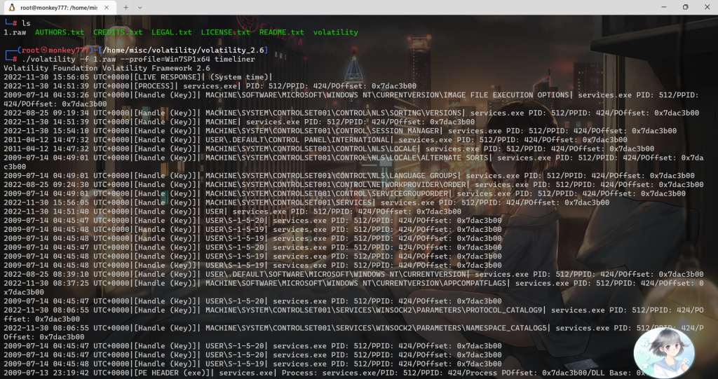 ./volatility -f 1.raw –profile=Win7SP1x64 timeliner