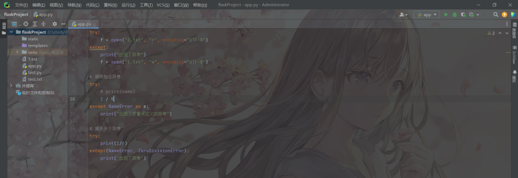 - 语法:使用try:可能发生的错误的代码except:如果出现异常执行的代码