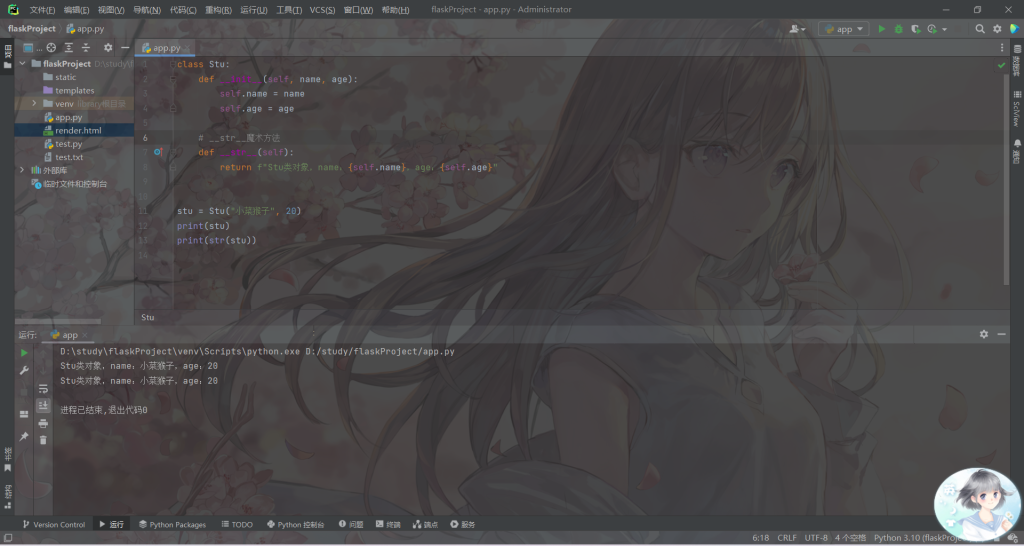 - __str__:字符串方法:当类对象需要被转换成字符串之时,会输出内存地址,我们可以通过__str__方法控制类转换为字符串的行为