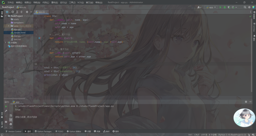 - __lt__:小于、大于符号比较,直接对两个对象进行比较是不可以的,但是在类中实现__lt__方法,即同时完成:小于符号和大于符号两种比较